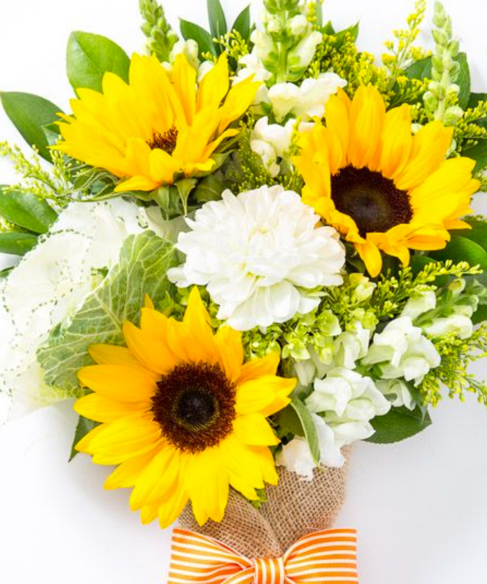 Arranjo de Girassóis com Folhagens Tropicais – Brilho e Alegria