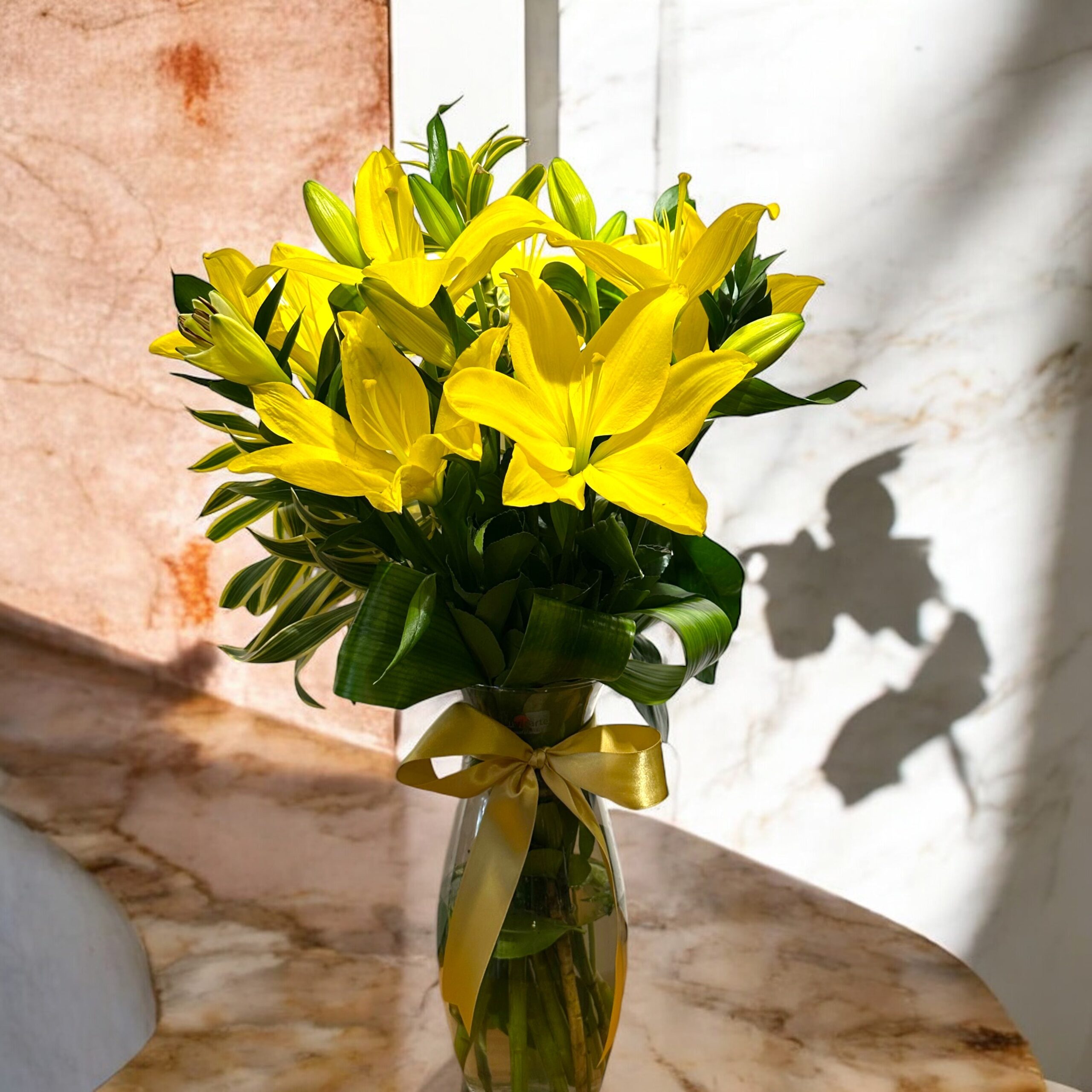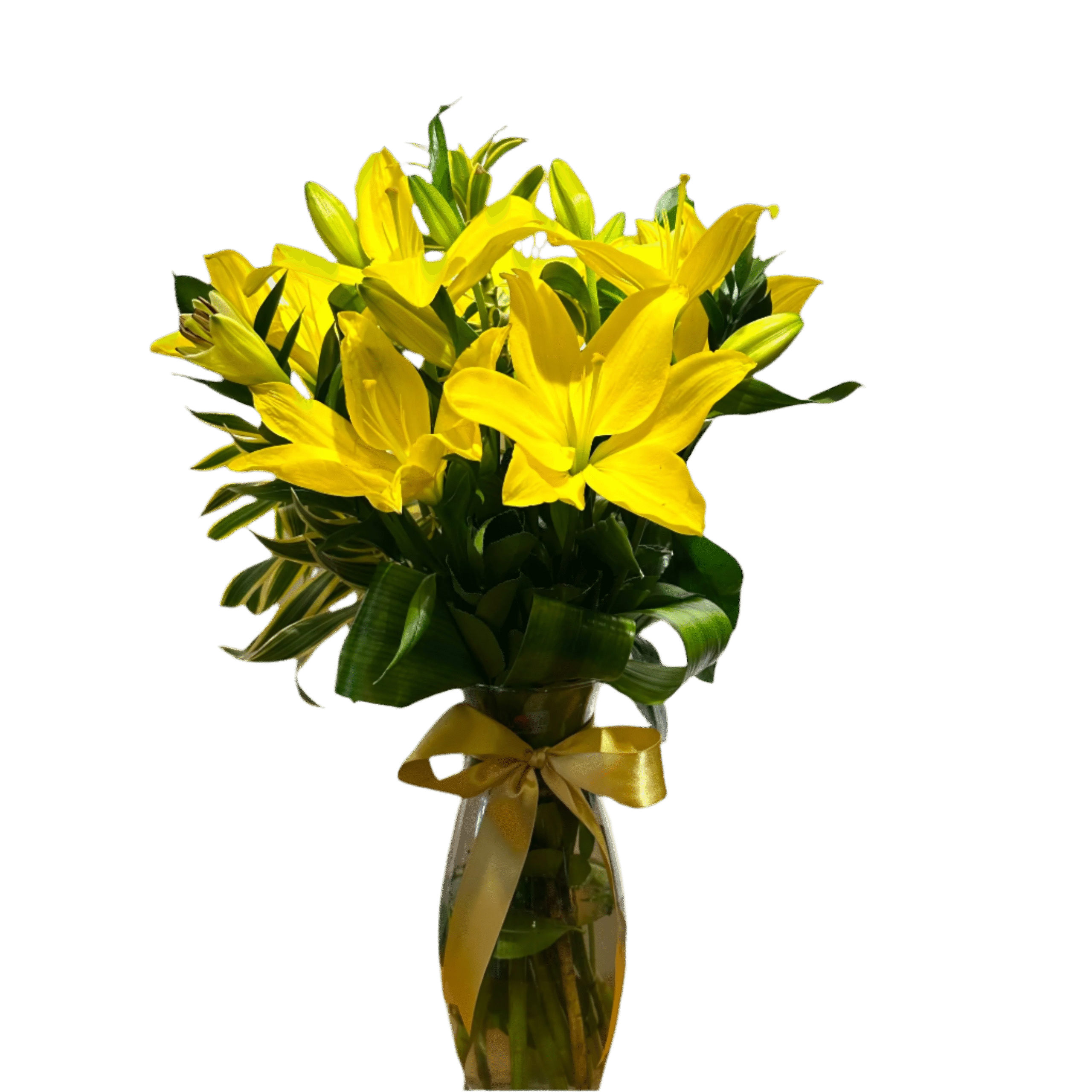 Arranjo de Lírios Amarelos – Brilho e Sofisticação em Vaso de Vidro